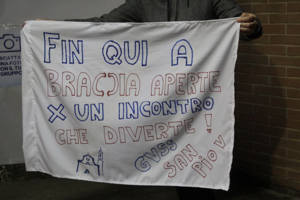 Durante questa fase introduttiva, nell’attesa che arrivassero tutti gli invitati, è stato chiesto ad ogni gruppo parrocchiale di realizzare, mettendo in campo tutta la propria fantasia, una bandiera da esibire a Roma per salutare il Papa. La cena non si è fatta attendere e, riscuotendo il gradimento di tutti i presenti, ha rappresentato un ulteriore “ingrediente” di un gioioso incontro.