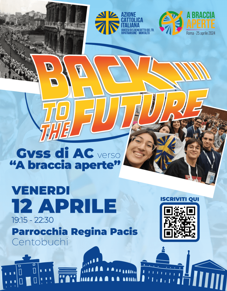 Sì, perché l’appuntamento del 25 aprile 2024 a Roma, con Papa Francesco, non rappresenta la classica gita “fuoriporta”, come si può essere portati a pensare, o semplicemente “un bell’evento da ricordare”, come ha spiegato don Roberto, ai giovanissimi della nostra diocesi che vi parteciperanno, durante la serata di venerdì 12 aprile: “Back to the Future – Gvss verso A braccia aperte”, dove questi sono stati invitati, dal settore Giovani della nostra associazione diocesana, per avere, attraverso attività e momenti di condivisione, l’opportunità di conoscersi tra loro, prima della partenza, e di conoscere la storia di chi in passato ha mosso i primi passi in Ac, contribuendo a realizzarne la bellissima Chiesa che è oggi.