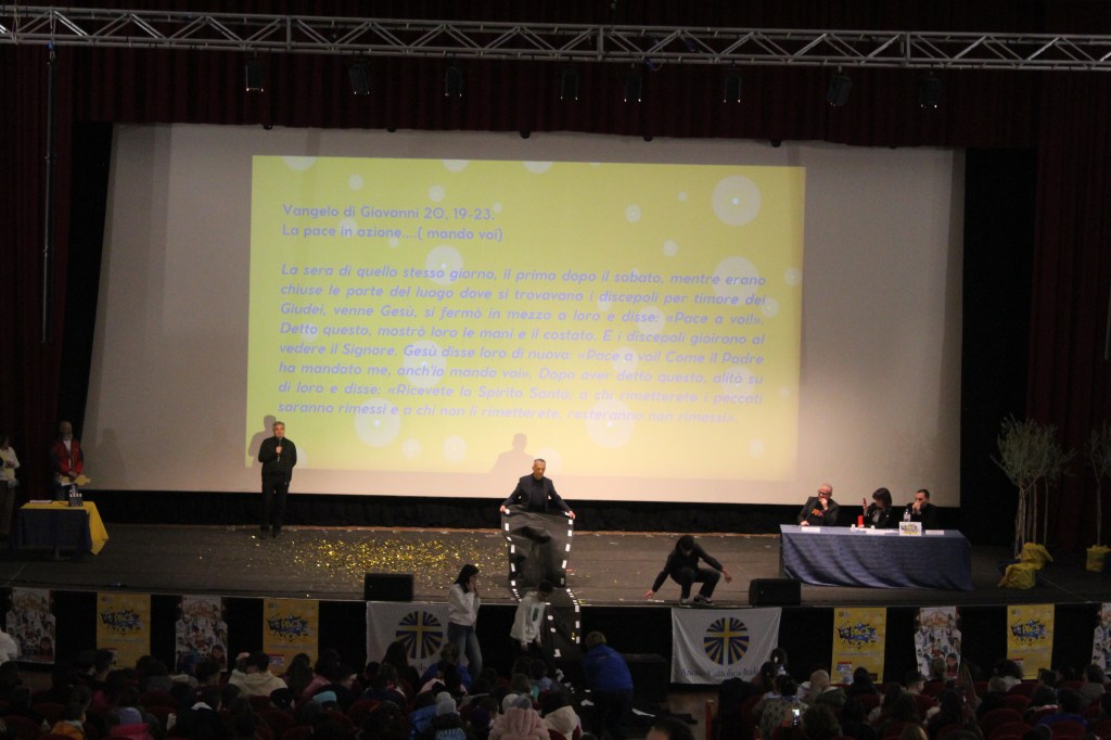 Ci hanno guidato l’assistente unitario, facendo lanciare ai ragazzi stessi frasi di incoraggiamento nell’impegno verso la pace, concluse “srotolando” lo slogan “ANCHE TU ATTORE IN AZIONE …” e il vescovo che, spezzando la Parola e intonando un bellissimo canto di pace, ha coinvolto tutta la platea dei ragazzi che hanno risposto con grande partecipazione.Nel ringraziare tutti coloro che nei modi più disparati si sono messi a servizio di questo grandioso evento, passiamo il testimone ad ognuno di coloro che a vario titolo ha partecipato, affinché sia sempre ispirato ad essere protagonista di “Azioni di Pace” nella propria vita.