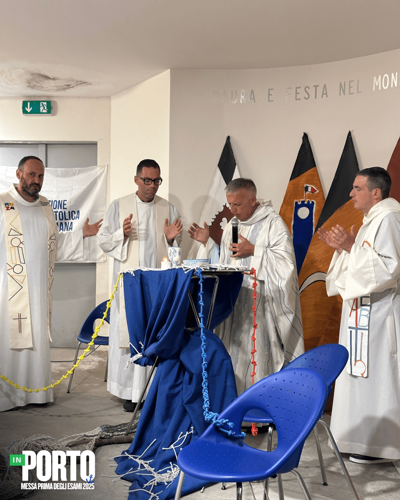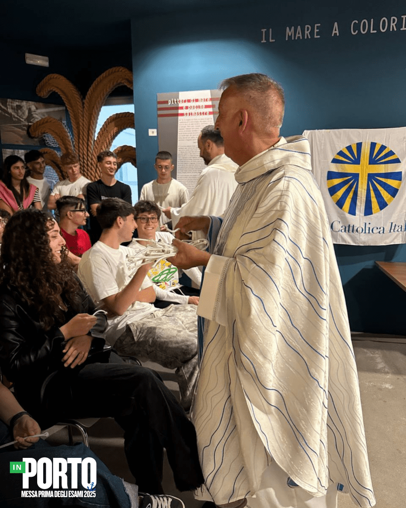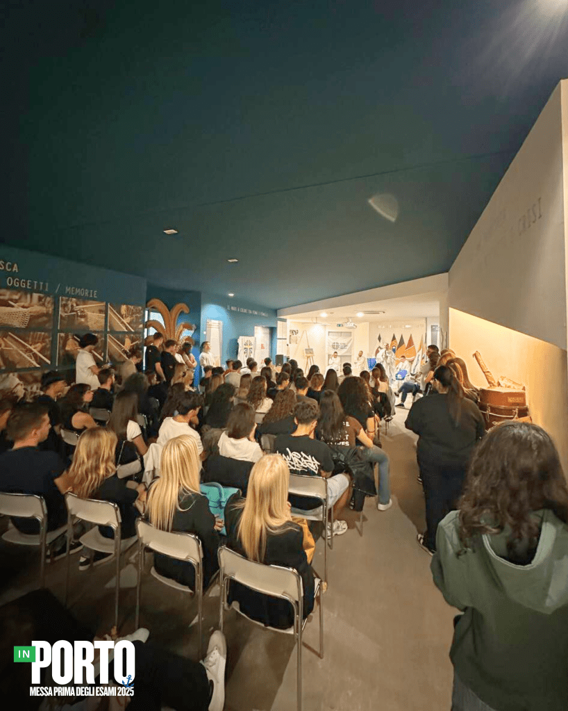 La sera del 17 giugno, sotto nuvole scure e cariche di pioggia, abbiamo visto arrivare tante e tanti giovani che, accompagnati da amici e compagni di classe, hanno accolto il nostro invito. Sui loro volti e nei loro occhi, specchio del cielo e dell’anima, si notavano sorrisi timidi, a volte nervosi, si percepivano pensieri affollati, nostalgici, incerti. Nonostante questo, con decisione hanno compiuto quei passi che li hanno condotti all’interno di una bella e accogliente sala del Museo della Civiltà marinara delle Marche. Per la nostra – ormai abituale – Messa prima degli esami, se fosse stata una bella serata estiva, avremmo dovuto ritrovarci al Molo nord di San Benedetto del Tronto, “in porto”, per attraccare la barca della vita e concludere felicemente la navigazione del percorso scolastico. Simboli, significati e metafore del mare, però, non sono mancati all’interno della sala che ci ha ospitato e per la cui disponibilità ringraziamo infinitamente il Museo del Mare della nostra città.