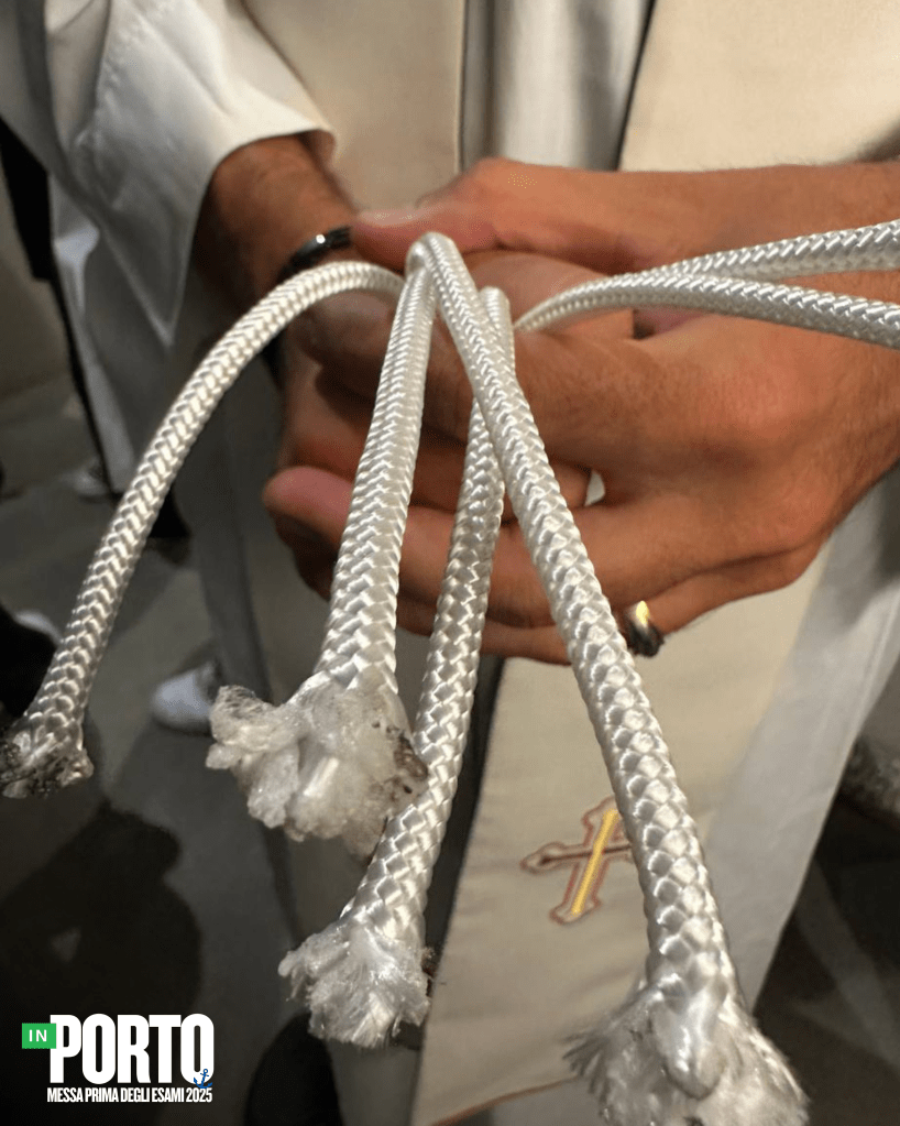 Ognuno ha ricevuto una piccola cima, simbolo del mare e strumento fondamentale da utilizzare in tanti modi e per motivi diversi: reggere l’ancora per restare al sicuro nei momenti più difficili e tempestosi, o issare le vele e seguire le rotte tracciate dal vento, o ancora, raccogliere le reti e il pescato che esse contengono. Questo segno invita ogni giovane a vivere in pienezza tutte le fasi della vita, senza paura, adattandosi a tutto ciò che dovranno affrontare, consapevoli di avere gli strumenti giusti per ogni situazione.