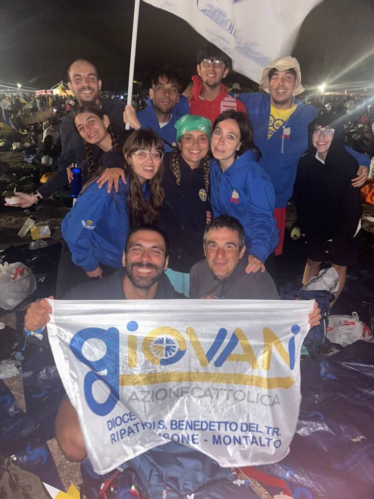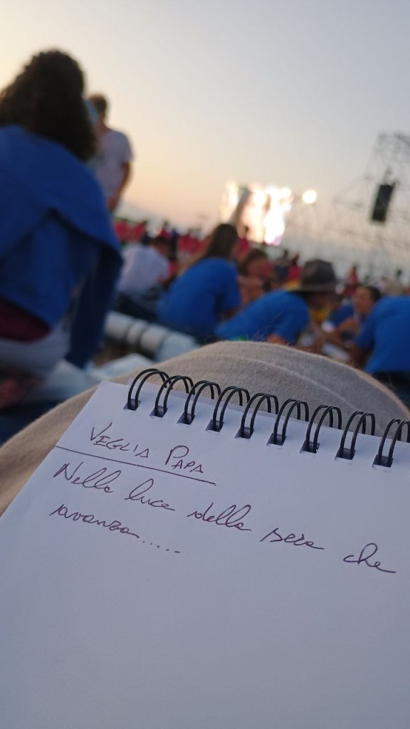 Con le nostre magliette azzurre – spicchio di cielo sulla terra, pezzetto di mare in città – ancora una volta abbiamo pregato, cantato e danzato con gioia, “al ritmo dello Spirito”. Poi finalmente, siamo arrivati a Tor Vergata: un immenso prato, un immenso popolo, un milione di giovani pronti a gridare “ECCOCI”, per ricordare al mondo che ci siamo, che siamo noi la Speranza. Dopo un cammino faticoso, tanta stanchezza accumulata e zaini pesanti abbiamo scelto la nostra area ed è stato come raggiungere la Terra promessa.