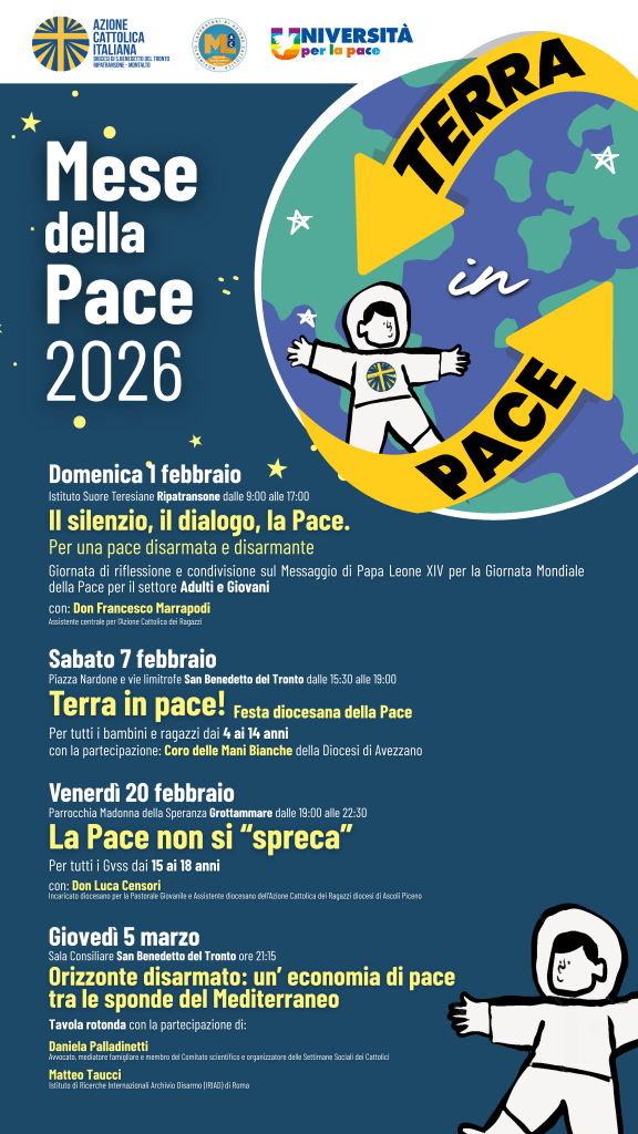 L’Azione Cattolica Italiana della Diocesi di San Benedetto del Tronto – Ripatransone – Montalto annuncia l’avvio del Mese della Pace 2026. Sotto lo slogan “Terra in Pace”, l’associazione desidera fortemente proporre un cammino di riflessione, preghiera e impegno concreto, ispirato al messaggio di Papa Leone XIV per la Giornata Mondiale della Pace: “La pace sia con tutti voi: verso una pace ‘disarmata e disarmante’”.