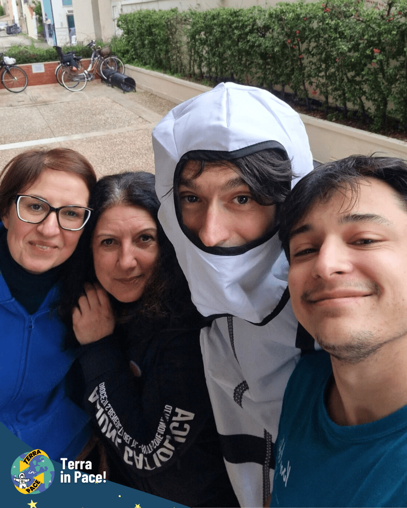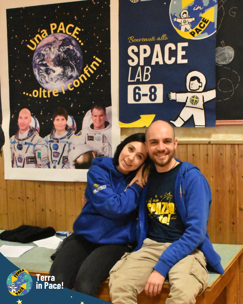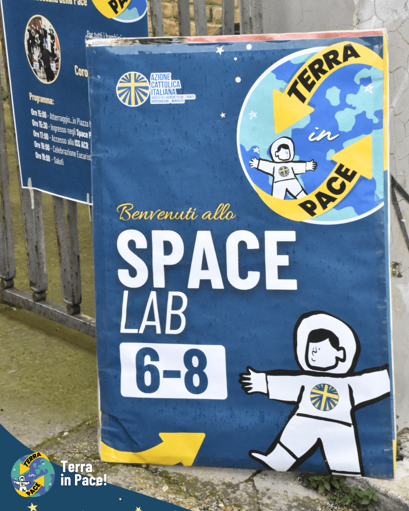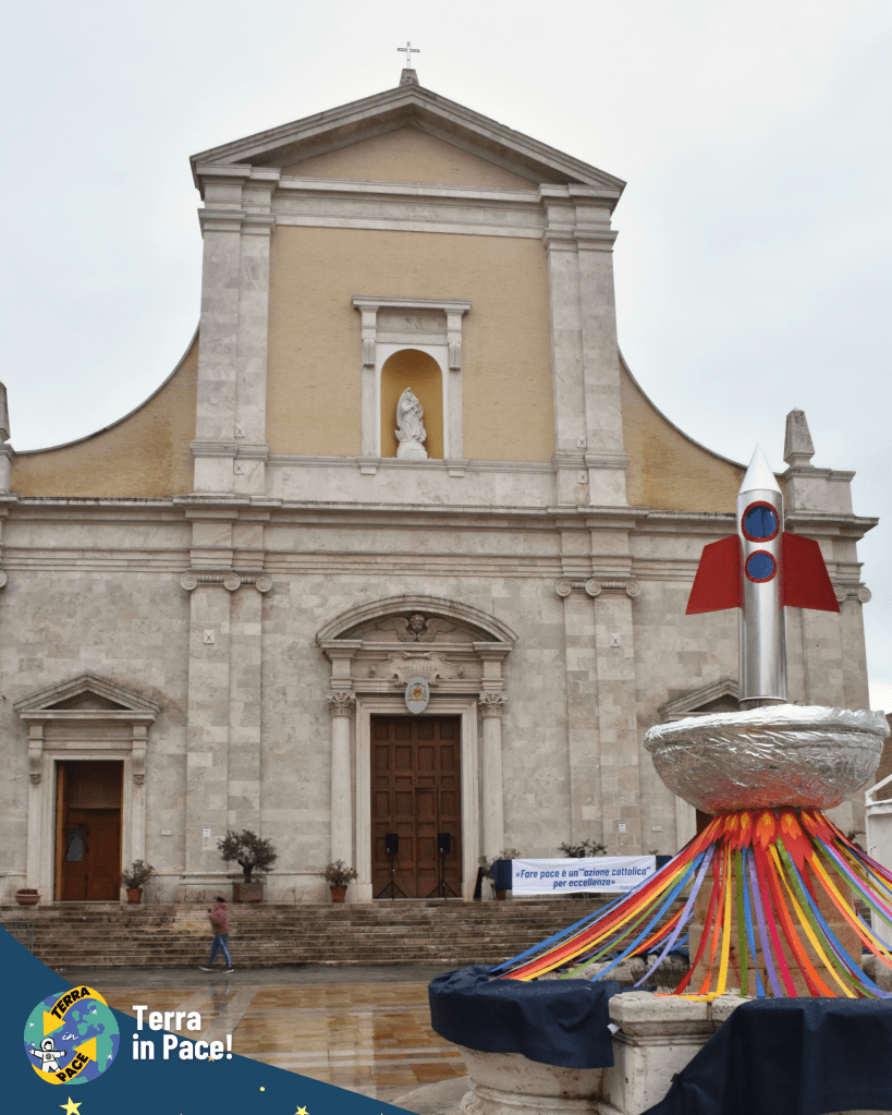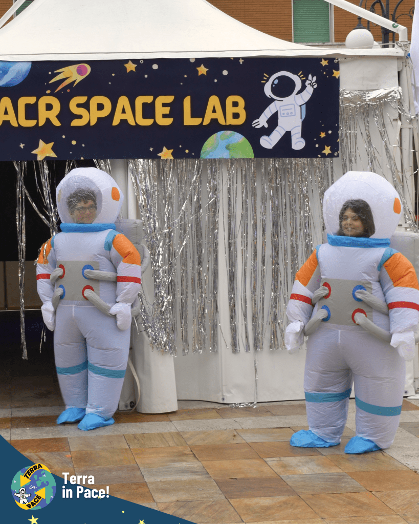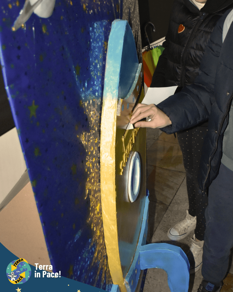 Un ringraziamento di cuore a tutti coloro che si sono spesi per la realizzazione di questa imponente esperienza. Come in un puzzle, ogni tassello — richieste, autorizzazioni e passaggi burocratici — si è incastrato perfettamente grazie a una collaborazione solidale e gioiosa tra giovani e adulti, già in sé una storia di cooperazione e di pace cominciata prima della festa. Nessuno si è risparmiato nella cura dei dettagli: dalla logistica della cucina all’allestimento dei punti gioco, dall’addobbo delle vie del centro fino alla trasformazione della Piazza in una fantastica Stazione Spaziale e della fontana in un coloratissimo missile di Pace. Grazie a chi ha curato l’amplificazione, a chi ha reso possibile l’emozionante concerto e, soprattutto, ai bambini, ai ragazzi e agli educatori che hanno partecipato con un’energia contagiosa, diventando il vero motore di questa bellezza.