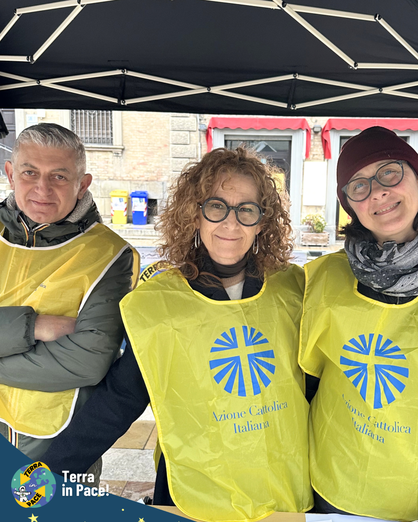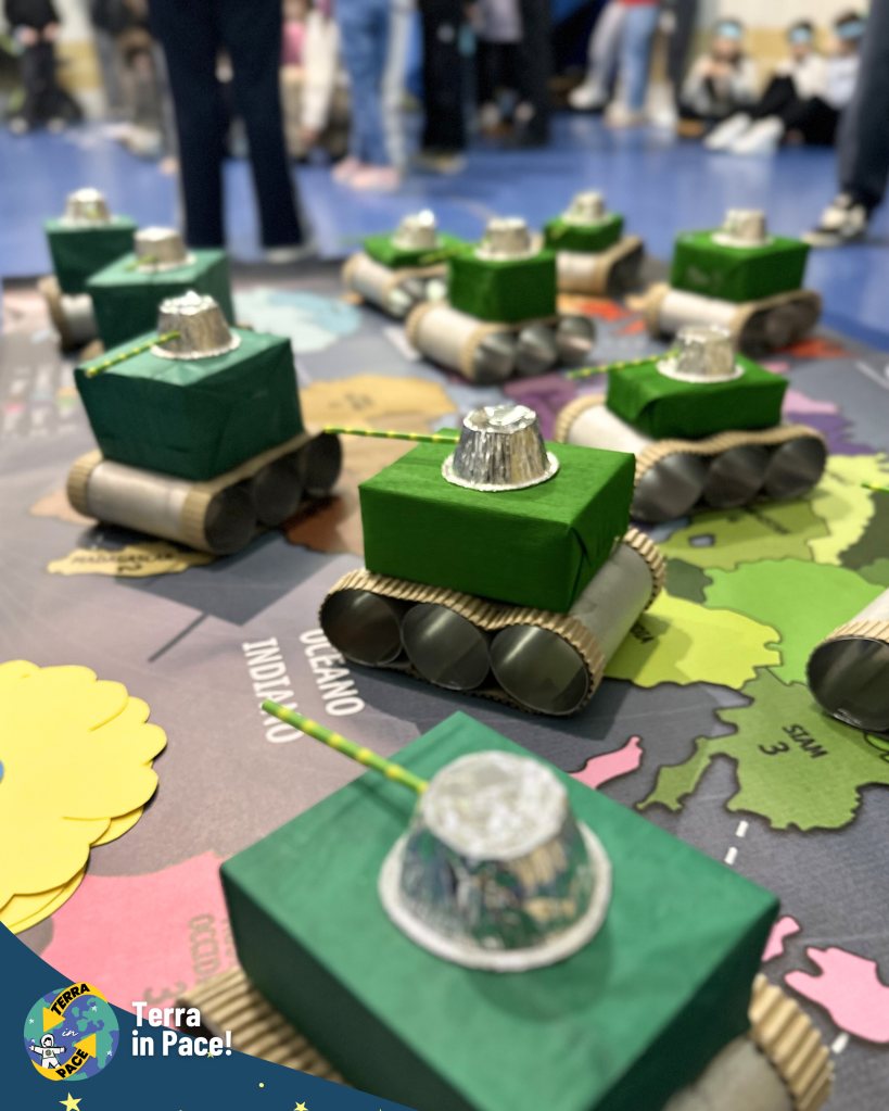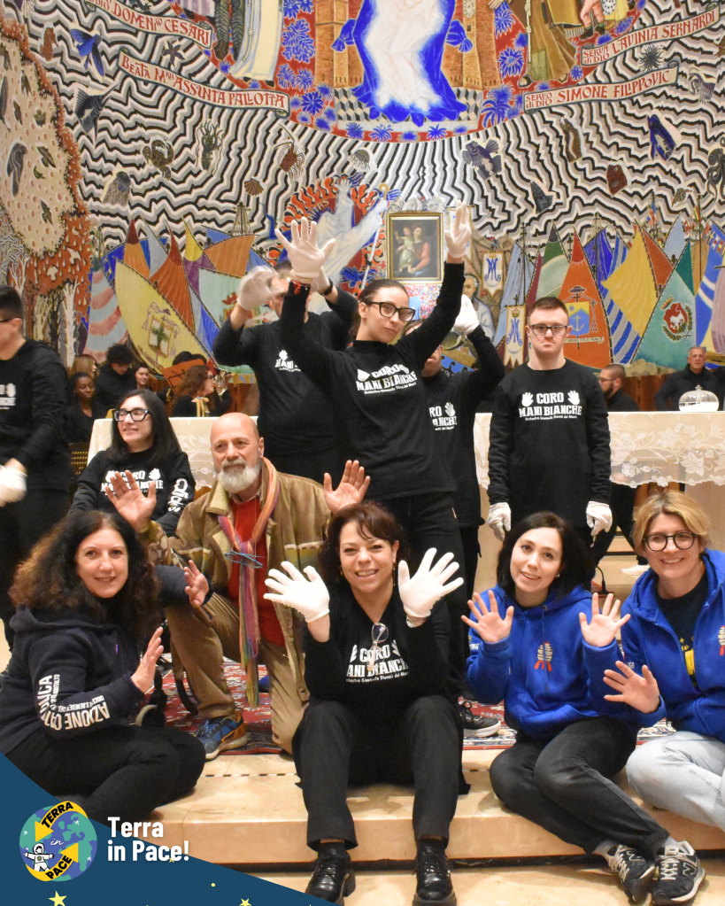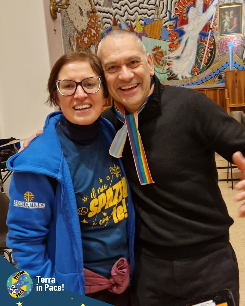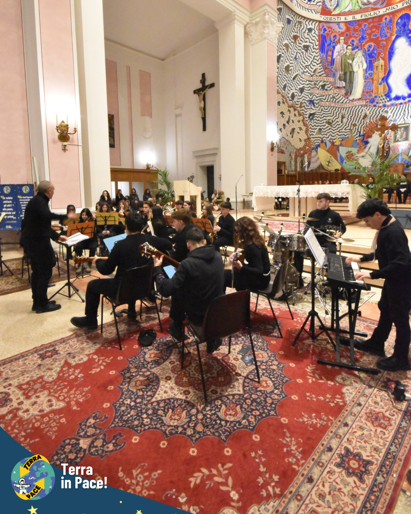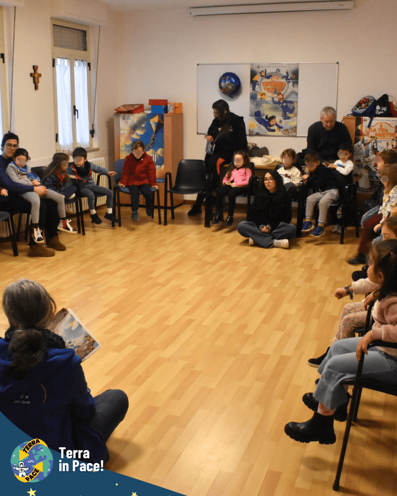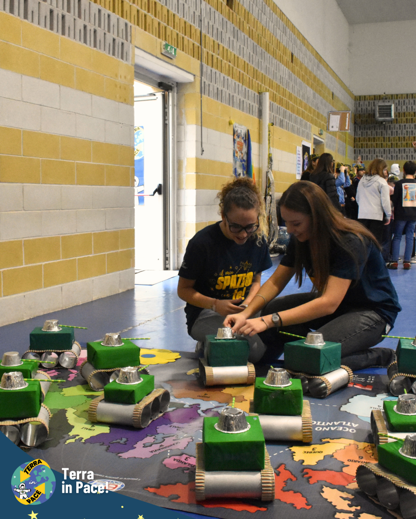 Un ringraziamento di cuore a tutti coloro che si sono spesi per la realizzazione di questa imponente esperienza. Come in un puzzle, ogni tassello — richieste, autorizzazioni e passaggi burocratici — si è incastrato perfettamente grazie a una collaborazione solidale e gioiosa tra giovani e adulti, già in sé una storia di cooperazione e di pace cominciata prima della festa. Nessuno si è risparmiato nella cura dei dettagli: dalla logistica della cucina all’allestimento dei punti gioco, dall’addobbo delle vie del centro fino alla trasformazione della Piazza in una fantastica Stazione Spaziale e della fontana in un coloratissimo missile di Pace. Grazie a chi ha curato l’amplificazione, a chi ha reso possibile l’emozionante concerto e, soprattutto, ai bambini, ai ragazzi e agli educatori che hanno partecipato con un’energia contagiosa, diventando il vero motore di questa bellezza.